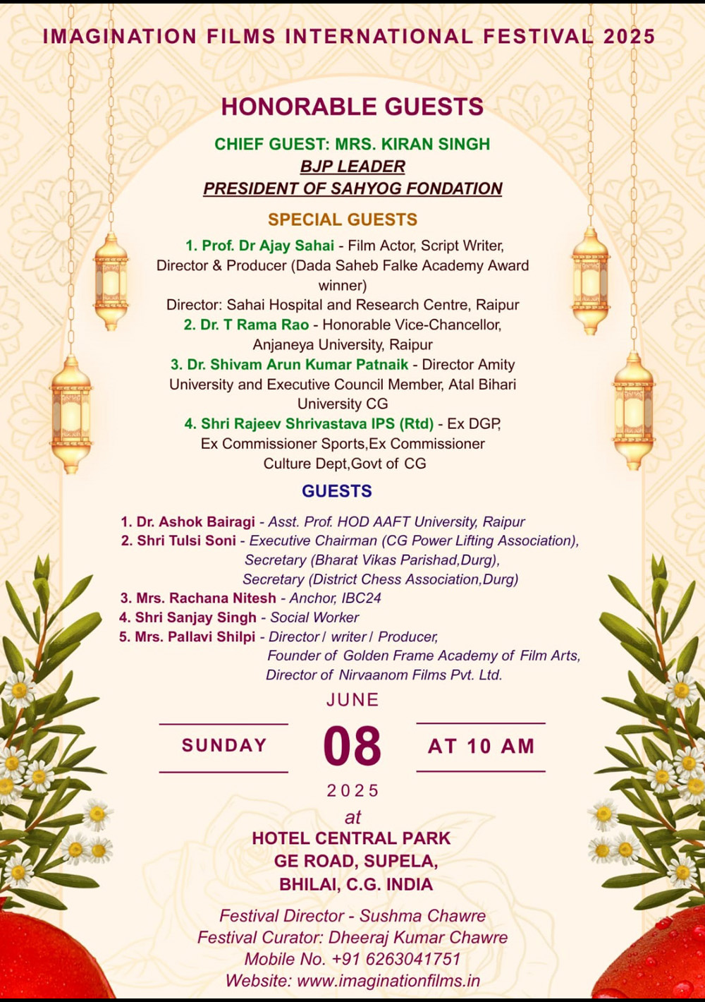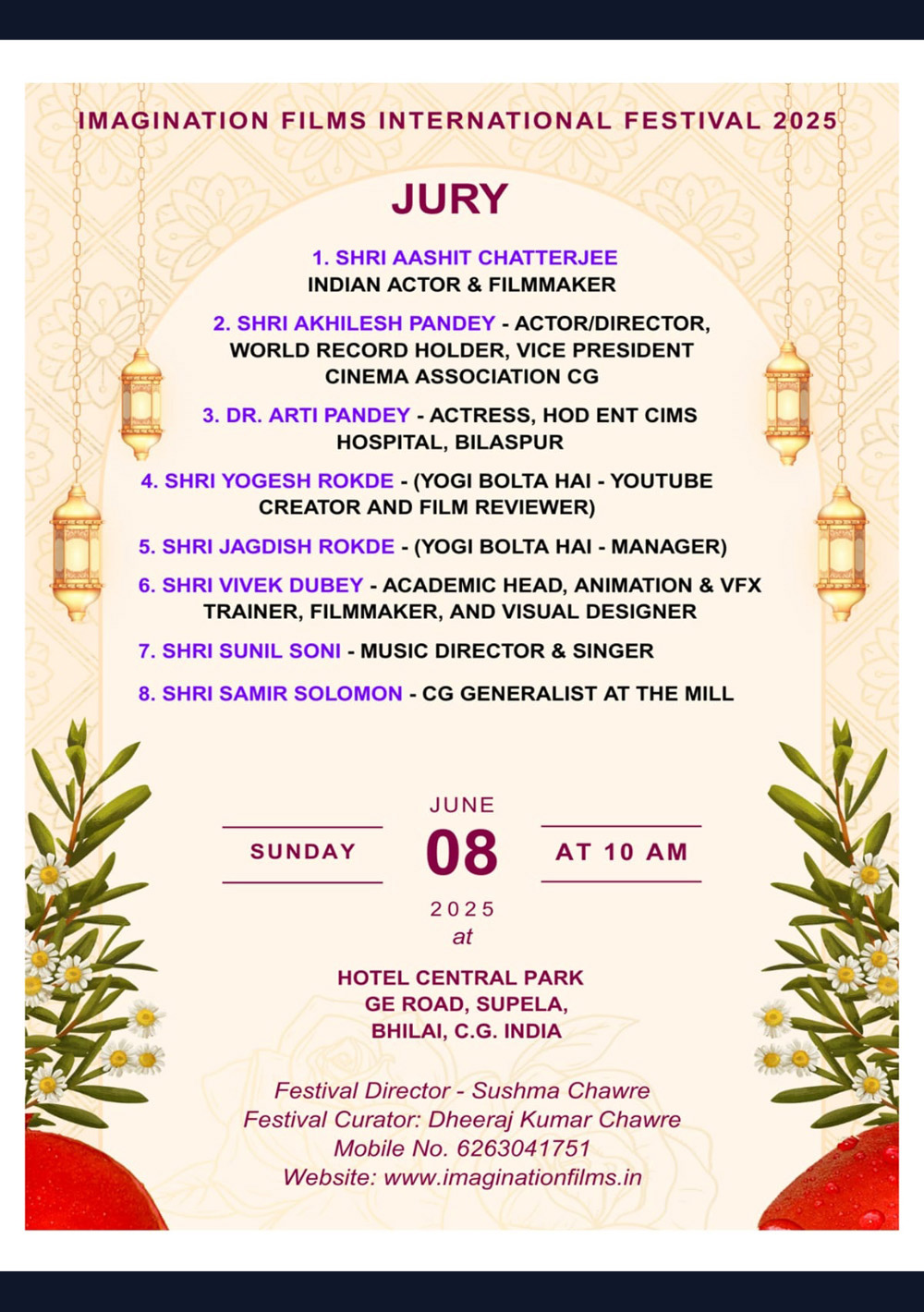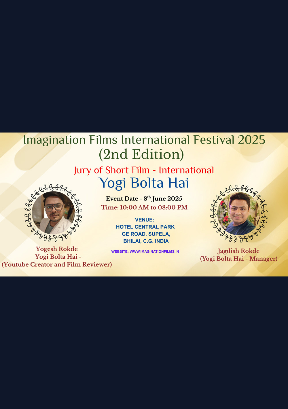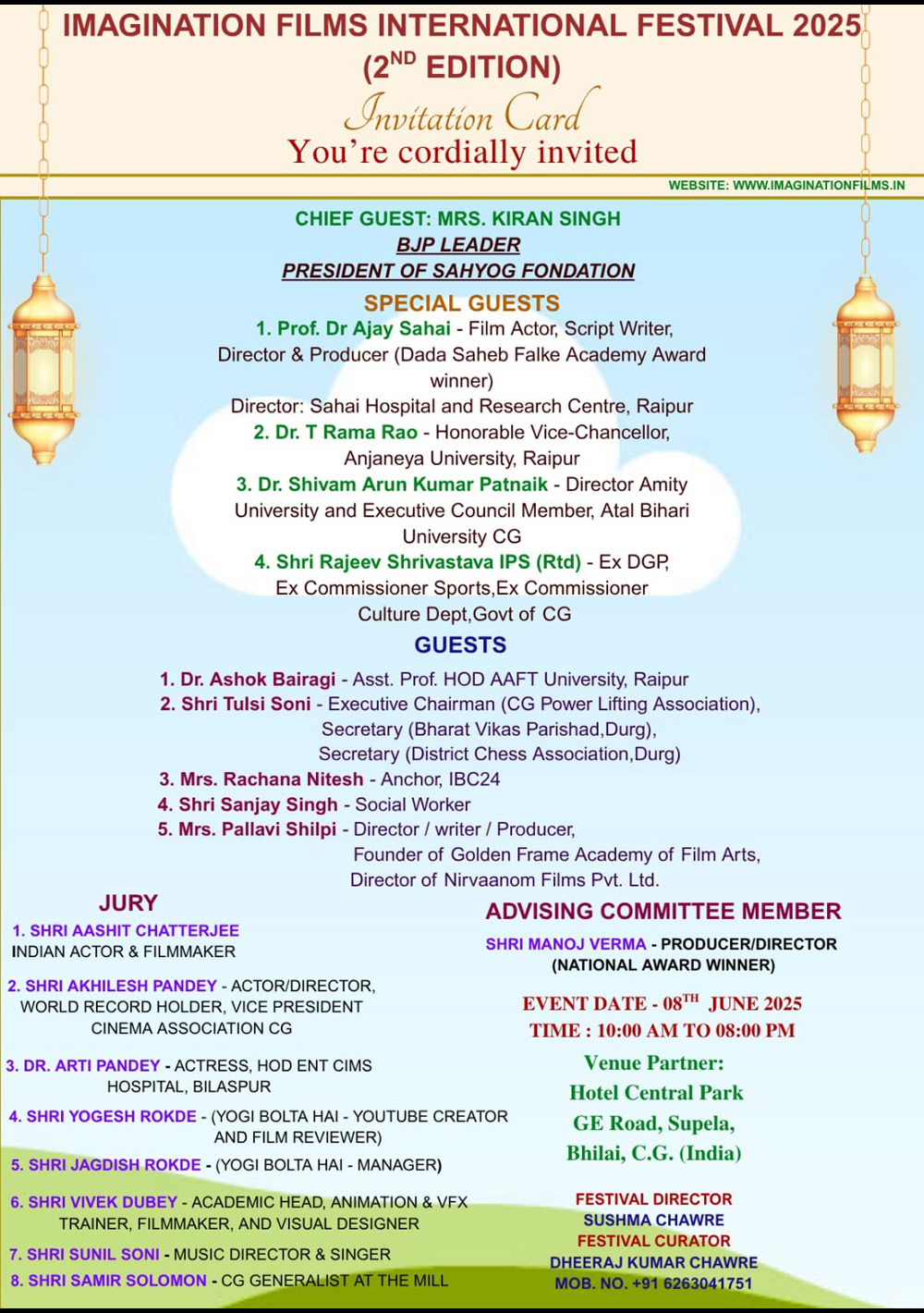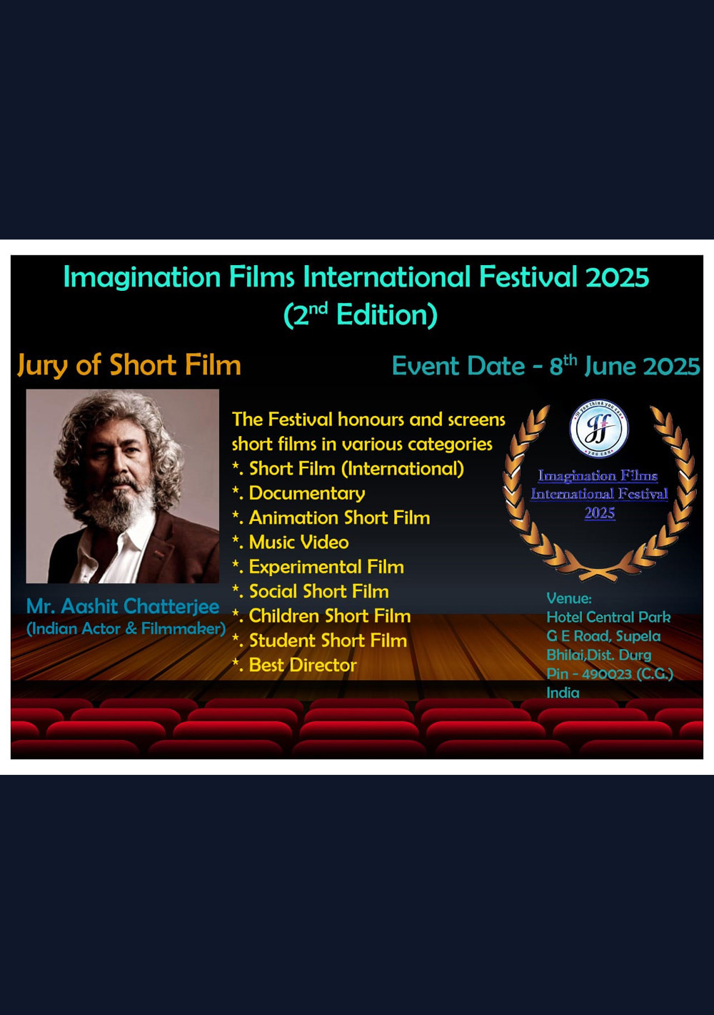 The 2nd Imagination Films International Festival was conducted on 8th June 2025 at the same venue i.e. Hotel Central Park, Bhilai. This time the festival has received nearly 3 times the entries i.e. 147 entries from 40 countries.