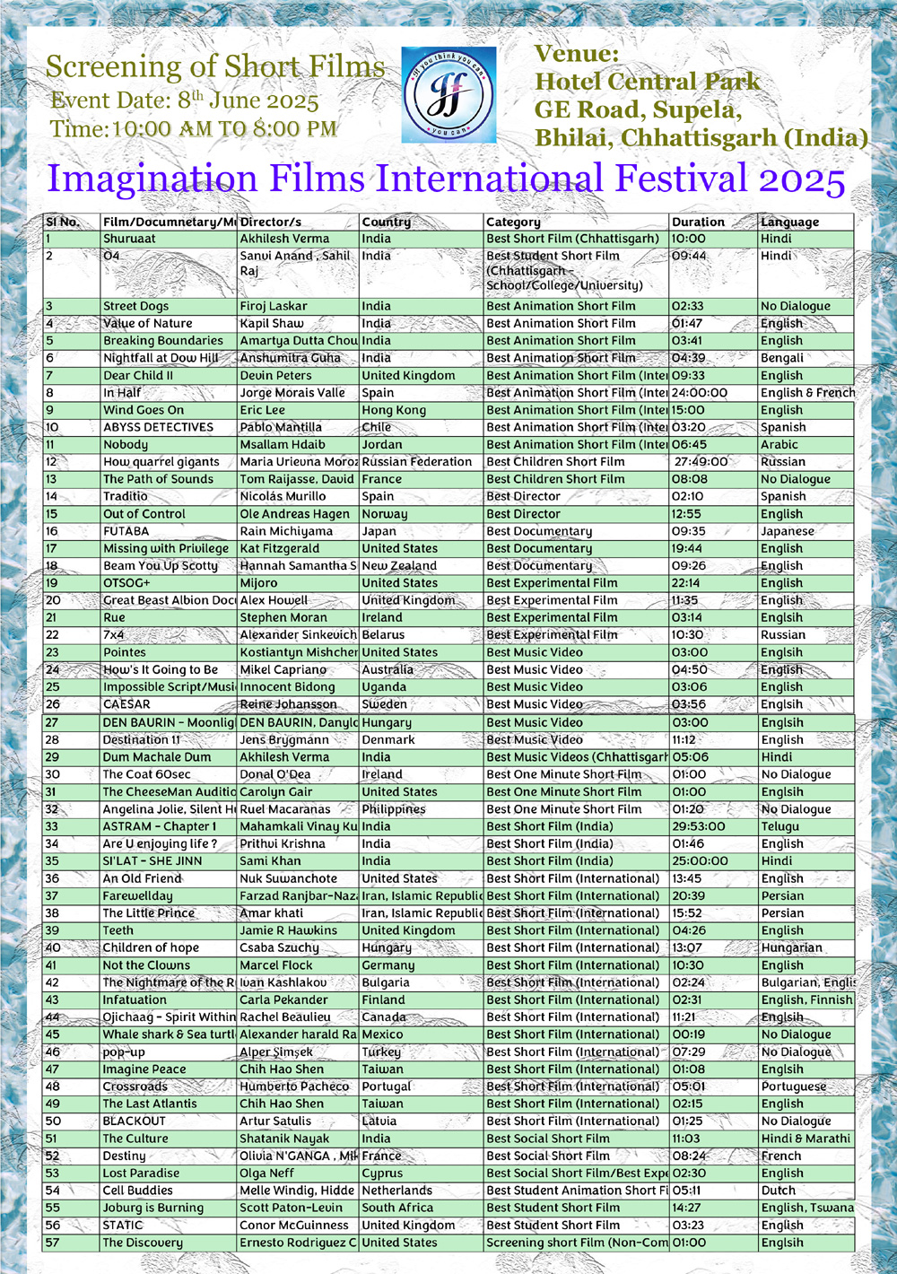 The 2nd Imagination Films International Festival was conducted on 8th June 2025 at the same venue i.e. Hotel Central Park, Bhilai. This time the festival has received nearly 3 times the entries i.e. 147 entries from 40 countries.